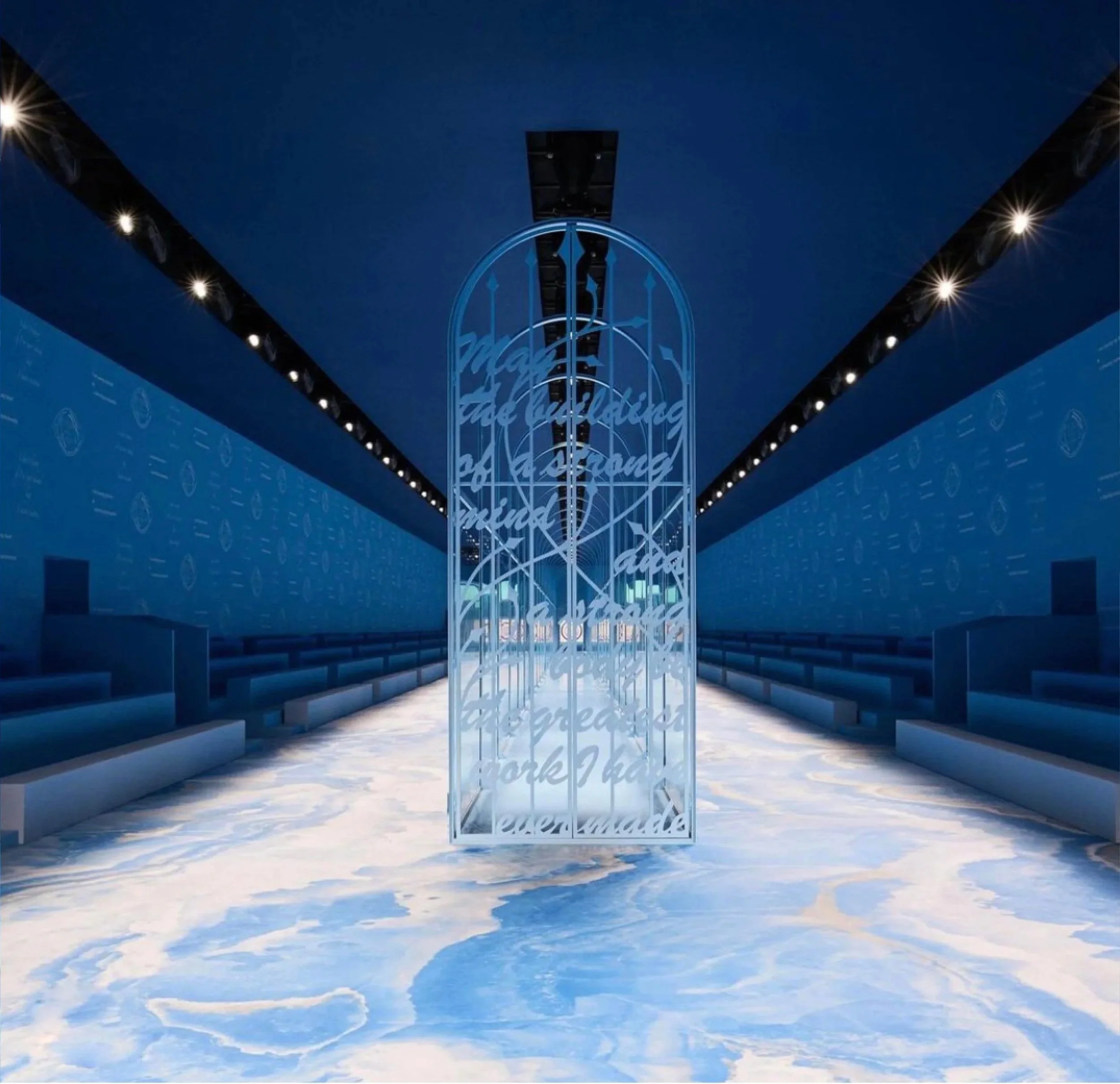 We were asked by the Parisian agency Bureau Betak to design the typographic decor for Dior SS25 show held in Paris on 24th September 2024. The space was specially conceived for Maria Grazia Chiuri’s show. Located in the gardens of the Musée Rodin in Paris, the transparent structure running the length of the runway was an installation by multidisciplinary artist Sagg Napoli, decorated with the artist’s texts, and in which, as an accomplished archer, she fired arrows at a distant target throughout the show.